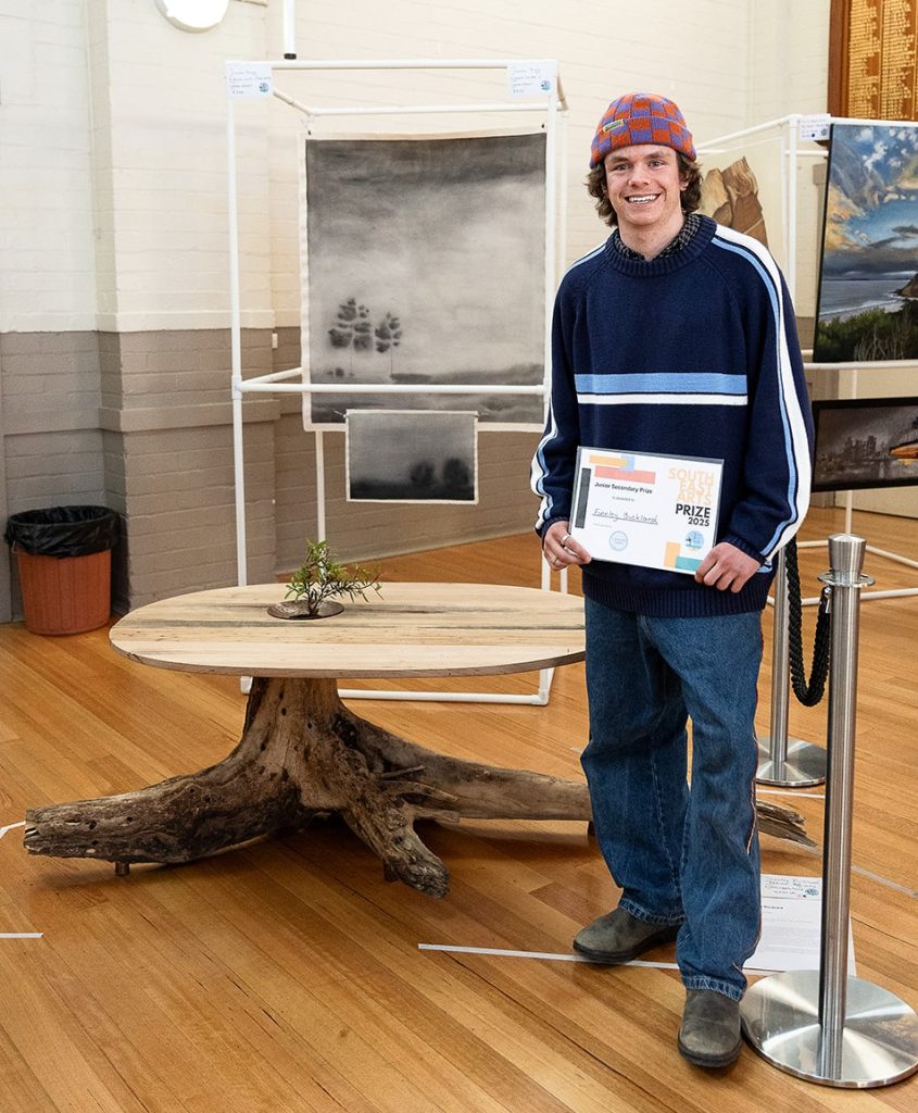 Junior Secondary Prize – Finley Buckland with his sculpture “Natural Affinity.”