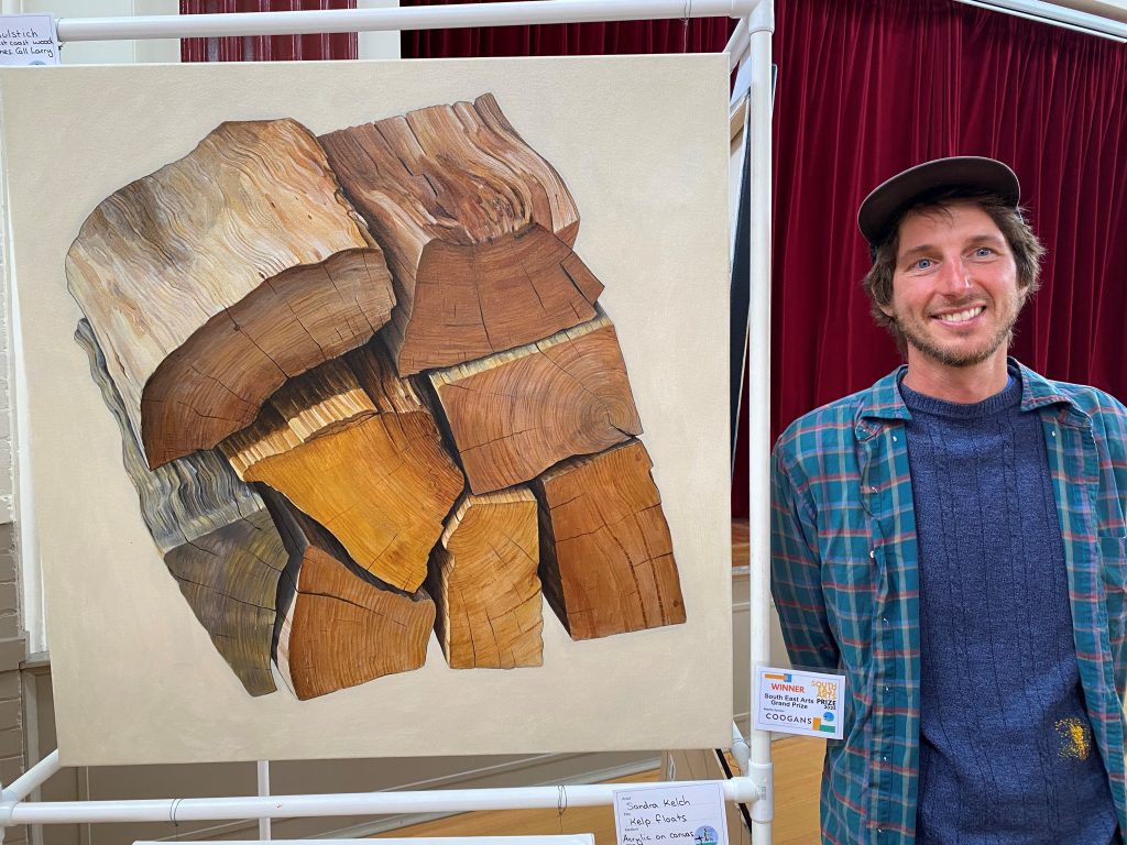 Major Prize – Tyler Faulstich with his painting titled “Very Dry East Coast Wood $750 For 3 Tonnes Call Larry”