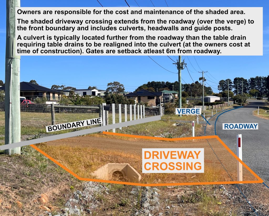 The property owner is responsible for providing and maintaining the driveway crossover under Tasmanian law. Council is responsible when damage to the driveway crossing is caused by Council works or if Council services need replacing.